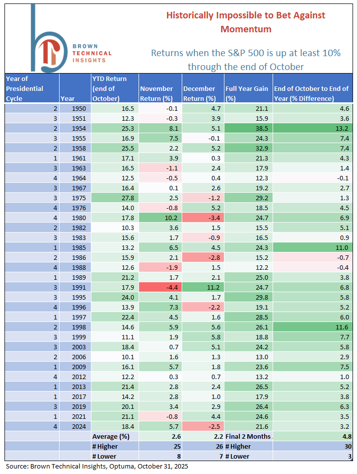 Here’s a look at a chart from Brown Technical Insights. It shows every year that the S&P 500 has finished 10% or higher through October. That’s happened 33 times since 1950. Only three times, was the Index negative in November and December. It happened in 1964, 1986, and 1988. In all three of those years, the Index was down less than 1%.
